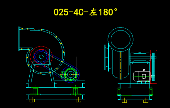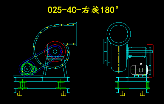 上圖為右旋180°的025-4C風(fēng)機(jī),人站在電機(jī)端正視風(fēng)機(jī),風(fēng)機(jī)葉輪的出風(fēng)方向?yàn)轫槙r(shí)針。